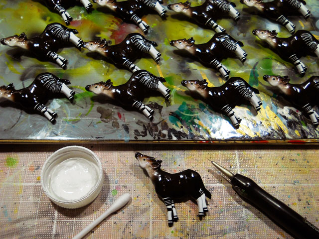 連日の秋晴れも今日のお昼前にいったんお休みとなりました。・°・。午後になって予報通り空が暗くなって参りましたので、洗濯物を早めに取り込みました。・°・。日暮れ頃になるとポツポツと雨音が聞こえて参りました。・°・。がんばって咲いていたゴーヤーの花でしたが、葉も小振りとなってきました。。そろそろ終わりかなと思うとちょっと寂しい気持ちになります。・°・。オカピの縞模様を施しました。用いる筆は極細の面相筆ですが、オカピの臀部の細かいラインには、筆先の毛が永らく使い込んで抜けて、3~4本まで少なくなったものが重宝しております。・°・。◎ 長ネギが手頃価格になってうれしい昨今ですが、納豆には特にたっぷり刻んで、てんこ盛りでいただくのがたいへん好きです♪ アトリエ☆イボヤギ 木村大介