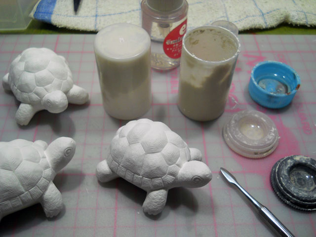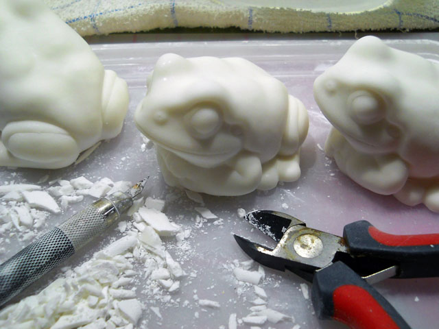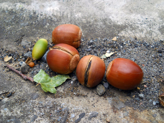 昨日通過した台風の置きみやげのように、坂道の歩道の吹き溜まりにドングリがたくさん集まっておりました。・°・。まだ青く小さいのはコナラでしょうか? 大粒でずんぐりしたのはクヌギかな?と思われます。・°・。なぜか縦割れのヒビが入っているのが多く見られましたが、大風にあおられて落下した時の衝撃なのでしょうか・・? 歩道にはまだ枝や落ち葉が少し散らばっておりました。・°・。* 昨日注型を終えたイエアメガエルたちのバリ取り作業に入りました。白いカエルたちを眺めておりますと、以前オーストラリアを旅した時、夜のキャンプ場のトイレの白壁に合わせて、体色を白く変えている姿に見惚れたことが想ひ出されました。・°・。◎ 秋も日増しに深まってきたこの頃ですが、先日一匹のオンブバッタが歩道の縁石をよいしょよいしょと懸命によじ登る姿を目にしました。。一面をアスファルトに覆われた路面から、ようやく草の生えた植え込みに辿り着いた時、ホッと安堵の溜息が聞こえてくるようでした。・°・。* アトリエ☆イボヤギ 木村大介