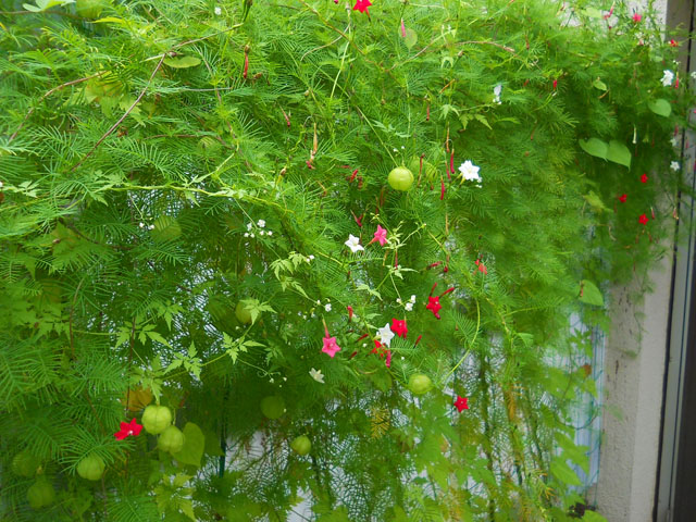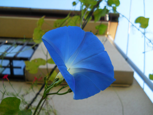 ツルの伸びが旺盛な西洋朝顔ですが、電線にまで絡みついた先にきれいな青い花が咲きました。・°・。雨上がりの澄み切った青い空によく映えてきれいです* 先日の市の無料健康診断の一環で、今日は眼科検診を受けに行って参りました。眼底検査ではとてもきれいな状態だとのことで、ほっといたしました。。これからまた一年、安心して制作活動に励めそうです。・°・。(@_@) 。・°・。右端の蜂の写真は多摩ZOO・昆虫生態園リポートの続きです・・温室の中で飼育展示されているものではないと思うのですが、花のつぼみの上に大きなハチがじっと動かずに留まっておりました。。なかなかかっこよいプロポーションでとても気になったので、ネット検索図鑑であたってみたのですが、まだ名前が判りません。。この間図書館で借りて読んだ「ハチ ハンドブック」に似た仲間が載っていた気がするので、またチェックしてみたいと思います。・°・。* アトリエ☆イボヤギ 木村大介