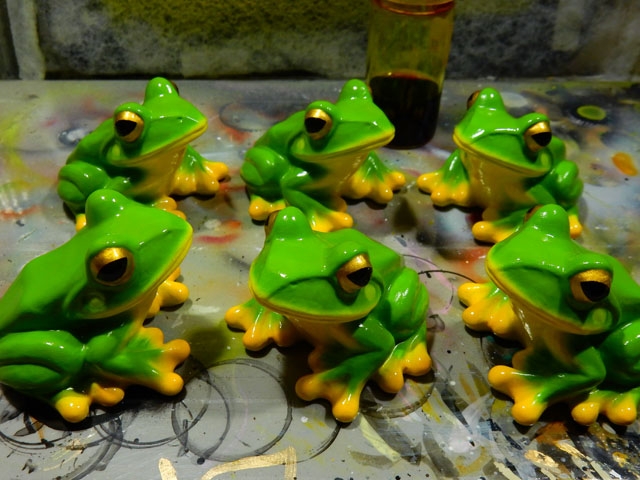 先日ご紹介した立体作品と並行して、ブローチ作品の制作も進めております。写真は定番アイテムのひとつオキナワアオガエルです。大方の塗装を終えたものに、立体作品と同様仕上げにはクリアーイエローを薄く吹き付けて、生き活きとした質感を醸し出しております。・°・。先日、駅の高架下にあるタクシー乗り場で、不思議な看板を見かけました・・・最初に目にした時には、古い看板に誰かがいたずら書きをしたのかな?と思ったのですが、近づいてよくみると妙な間隔で羽の生えた虫の絵は、当初から意図的に描かれていたようです。。そうと分かると、なんともハイセンスな?すてきな看板に思えてしまいました(^^) 先日訪れた樹木の種類の多い、大きな公園の池にある草の茂った人口島の上で、二羽のカルガモさんがまったりと寛いでおりました。春の日差しを受けてとても気持ちよさそうに見えました。・°・。つづく 2017/03/19(日) アトリエ☆イボヤギ 木村大介