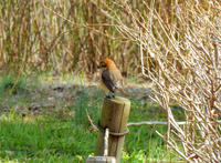 先週から制作を進めて参りました、立体かえる作品のヤエヤマアオガエルの方は無事に完成しました(o^-^o) 写真は仕上げのクリアーイエローを吹き掛け終えたところです。・°・。それでは先日訪れた春先の自然散策記のつづきをお届けいたします・・・樹木の種類の多い大きな公園のバッタらんど(ススキや葛などの生えた草地をなるべく自然のままにして、虫たちが暮らせるようにしたエリア)で、一羽のツグミさんがじっと空の方を見つめておりました。こちらが少しずつ近づいても気が付かないのか?だいぶ近くに寄るまでそのまま上の方を気にしている様子でした。。もしかしたら鷹などの猛禽を警戒していたのかもしれません。実際、しばらくしてオオタカかな?と思われる鳥の姿も遠目に確認いたしました。お互いの距離は5メートルくらいだったでしょうか?ツグミさんもようやく気が付いたみたいで「はっ」としたような表情でこちらを見返して、そそくさと走り去ってゆきました(^^)