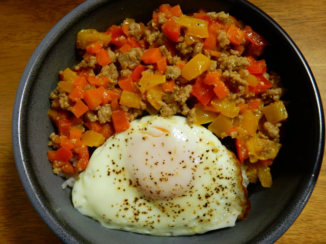昨夜の雨は明け方にかけて激しい降り方をしておりましたが、次第に雨音が小さくなって昼前には晴れ間がのぞき始めました。・°・。本日は外出を控えてブローチ作品のバリ取り作業に専念いたしました。写真はオキナワアオガエルですが、指先の細かい部分になかなか時間を要します。・°・。(*_*)  冷蔵庫で出番を待っていたカラーピーマンたちが、そろそろ傷みかけて来たので、先日ゲットした霜焼けニンジン(冷温障害なのか?皮が少し黒ずんで半値引きになっていたもの)といっしょに細かく刻んで、豚ひき肉と共に味噌炒めにしました。タイ式の本格的なものではございませんが、目玉焼きも添えてなんちゃってガパオライスにしていただきました。細かい作業の連続で疲れた目にもやさしい、カロテンたっぷりの美味しいどんぶりとなりました(o^-^o)♪。・°・。2016/12/14(水) アトリエ☆イボヤギ 木村大介 〈本日のタイトル解説:『 彩のパプリカ刻んでガパオ丼。・°・。(o^-^o) 』〉