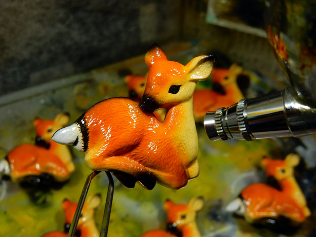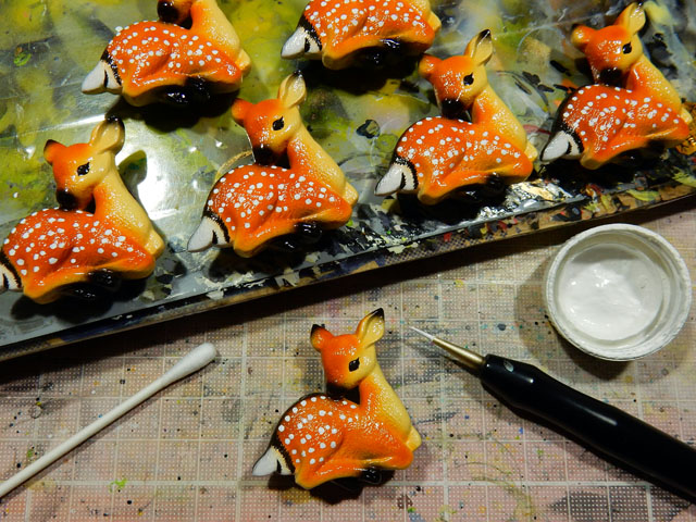 関東においては文化の日は晴れの特異日とも言われておりますが、本日はお約束通りお日さまに再会できて、気温の方も平年並みの過ごしやすい一日となりました。・°・。ヽ(´▽`)/ アトリエでは帯留め作品の鹿の仔の塗装を進めました。最初の画像は眼まで描き込んだ段階で、いったん塗料を定着させるためにラッカーのクリアー色を吹き付けているところです。表面が乾いたら、アクリル絵の具で鹿の子模様を筆描きしてゆきます。ランダムなようで一定のパターンがあるので、鹿の写真などを参考にしながら慎重に描き込んで参ります。・°・。先日スーパーの青果コーナーの片隅で、値引き品の籠の中に大玉の梨を見つけました。品種名は書かれておりませんでしたが、特に傷みもなかったのですかさずゲットいたしました。切ってみると瑞々しさたっぷりのおいしい梨でございました(o^-^o)♪ 2016/11/03(木) アトリエ☆イボヤギ 木村大介 〈本日のタイトル解説:『 鹿の仔の 鹿の子模様を 描き込む。・°・。* 』〉