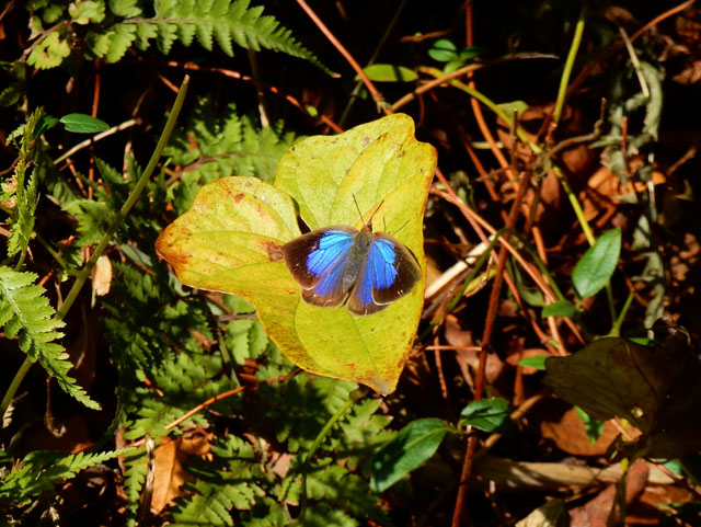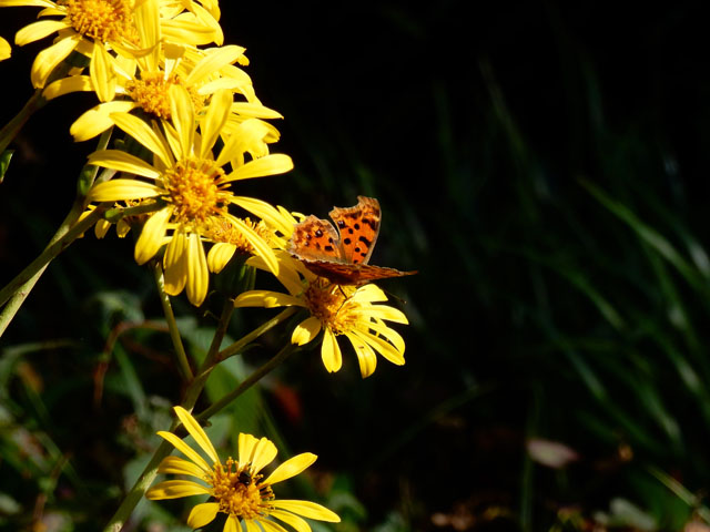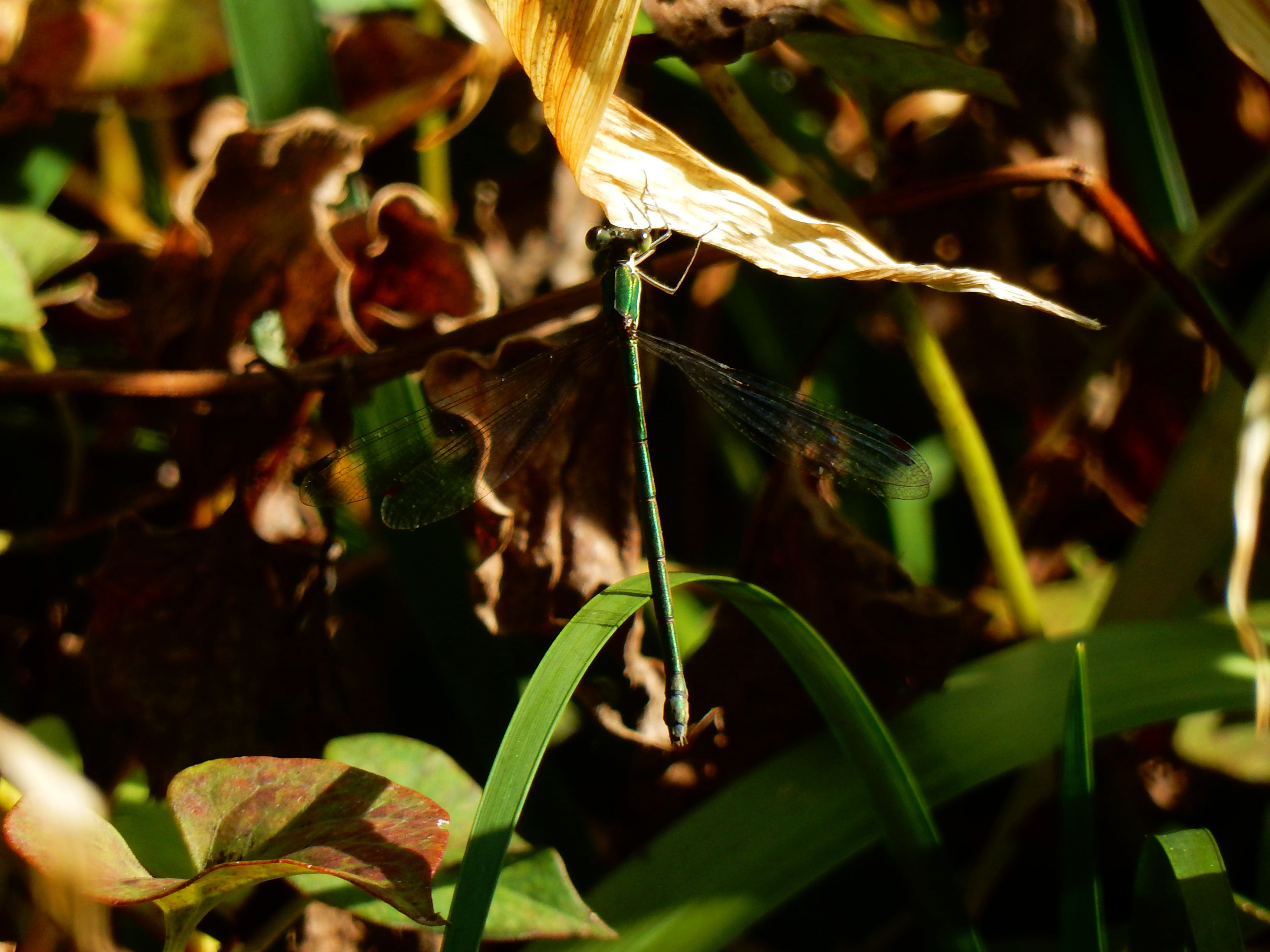 少し前のことになりますが、11/13(金)の小春日和の陽気に包まれた日に訪れた、雑木林のそばにある池畔の散策をお届けさせていただきます。・°・。ツワブキの花が満開で、あたたかい陽射しを受けて輝く黄色い花の上には、キタテハさんが長いこと夢中で吸蜜しておりました。・°・。友人が指さす方向をしばらく凝視して、ようやくイトトンボが留まっていることに気が付きました。後で調べてみたところオオアオイトトンボかな?と思い至りました。青緑色のメタリックが輝いて見えました。・°・。*