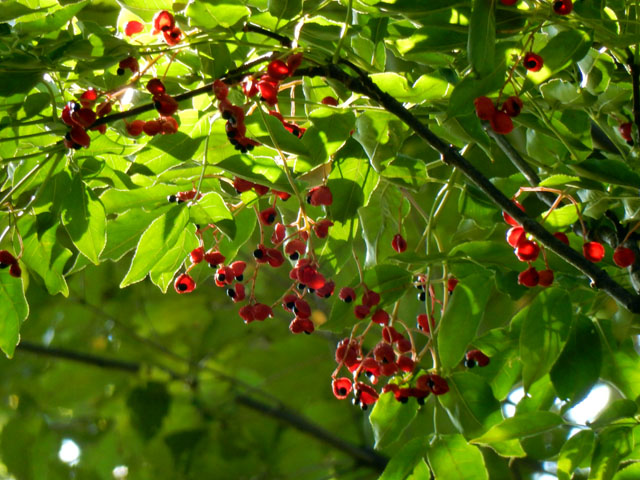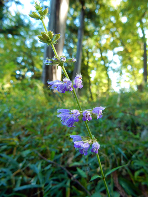 11/13(金)の小春日和の陽気に包まれた日に訪れた、雑木林のそばにある池畔の散策・その3をお届けさせていただきます。・°・。池から離れて雑木林の中を歩いておりますと、段重ねに咲いている紫色の花が目に留まりました。後で調べてアキノタムラソウかな?と思い至りました。・°・。頭上を見上げると、小さな赤い実が木漏れ日を透かしてたくさん実っているのが見えました。カメラのズームで確認してみると、権萃(ゴンズイ)の実だと分かりました。・°・。葉の落ちた小枝の先にはアシナガバチの仲間のものかな?と思われる大きなハチの巣がございました(*゜0゜)