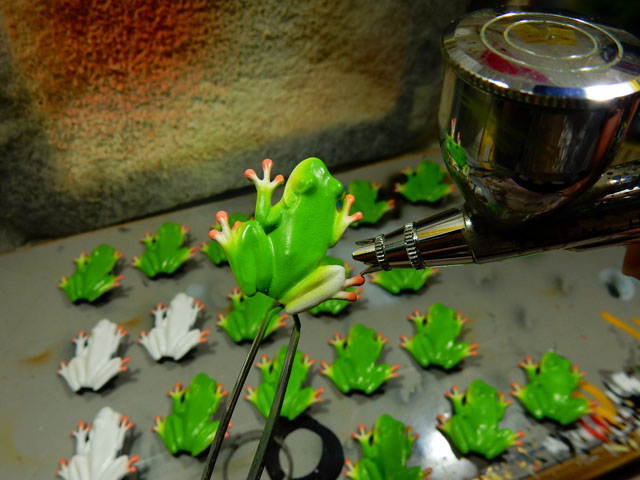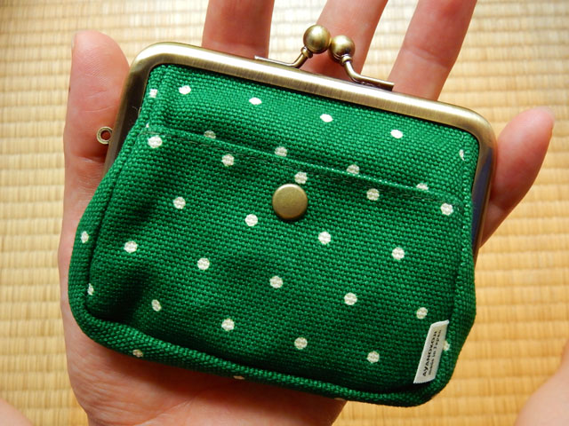 小生のカエルのブローチ作品は様々な種類がございますが、中でもダントツに人気をいただいているのは、写真のオキナワアオガエルです。カエルらしい色といえば=緑色というイメージのゆえんでしょうか・・・? 実際に個展などにいらしたお客様から、カエル好きの知人へのプレゼントとしていろいろ迷われた挙句、やっぱり緑かな?と言われることもしばしばございます(◎⌒▽⌒◎) そんなわたくしも緑色が大好きですが、愛用していたお財布がボロボロになっていたのを見かねた友人から、すてきな色と柄の がま口財布のプレゼントをいただきました(⌒‐⌒)♪ ちょっと大きめのサイズで使い勝手の良いデザインでした(^-'*) アトリエ☆イボヤギ 木村大介