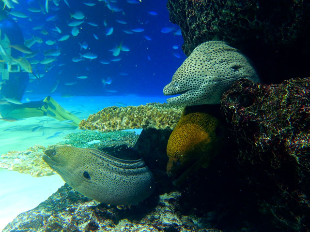 先週末に訪れた、年パスを買って三度目のサンシャイン水族館訪問記・その1をお届けさせていただきます・・・沖縄のサンゴ礁再生プロジェクト水槽では、パイプの先に固定されたヨコミゾスリバチサンゴが、まるでブティックのショーウィンドウに並べられた、オシャレな婦人帽のようにも見えてしまいます・・・(^^) ラグーン大水槽ではヒフキアイゴさんたちがたくさおりますが、何度か通ううちに黄色地に入った黒い模様の形から、それぞれにニックネームを付けて親しみを感じるようになりました♪ 写真の個体は人魂のようにも見えることから「たまちゃん」と勝手に呼ばせていただいております(⌒‐⌒) 今日はドクウツボとニセゴイシウツボさんたちが三匹仲良く?いっしょに並んでおりました♪