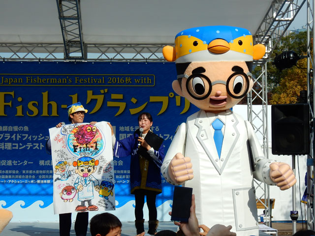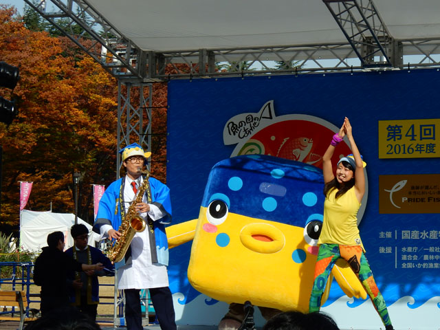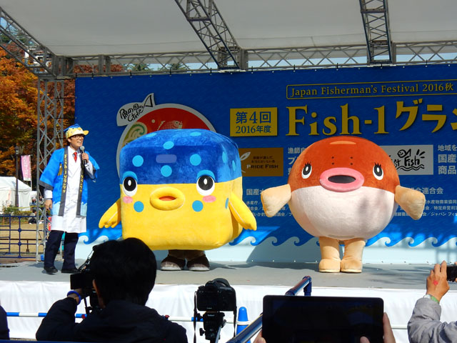 本日(11/20)は、朝から澄み渡った青い空のもと、日比谷公園にて開催の第4回Fish-1グランプリへ参りました。フィッシュワングランプリは『全国の地元漁師が自信を持って勧める魚として選定された"プライドフィッシュ"を素材にした料理と、気軽・手軽に食べられる国産の水産物を使った加工品のコンテスト』というイベントで、会場には全国各地から集まった地元産の素材を使った料理のブースが立ち並んでおりました。そして前回同様今回も、さかなクンのステージがございました。今回初披露となる さかなクンが考案したという、身長3メートルの巨大な さかなクンロボット「ギョボット」と、ハコフグをイメージした「ボックスくん」、そしてホテイウオをイメージした「ボールちゃん」が登場しました(*゜0゜) ギョボットの帽子のハコフグには「クレバちゃん」という名前が付いておりました・・・そして胸鰭と口を動かしながら、ぎょぎょぎょぎょ~としゃべりました・・・(・Θ・)!