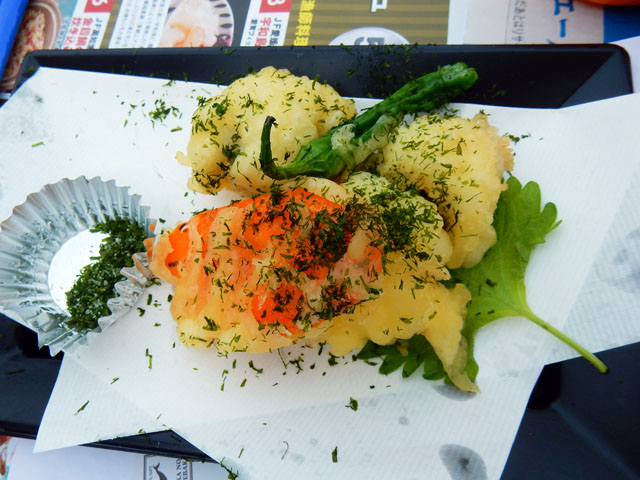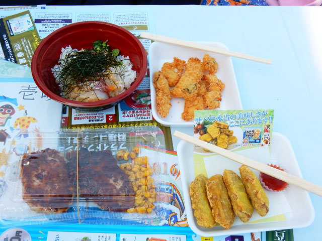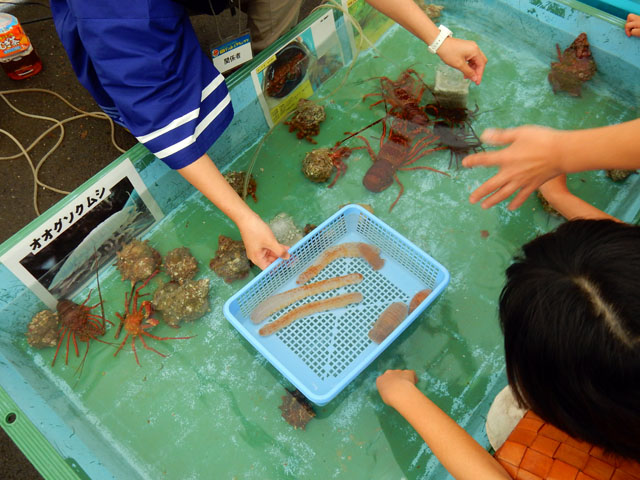 中段左端の写真の料理は左上から愛媛の「宇和島鯛めし」、富山の「すぐ食べられる車だい昆布じめ・揚げ焼き」、全国いか釣り漁業協会の「イカハンバーグ」、静岡の「いとうナゲット」。そして隣の写真は徳島の「とくしまのはも」の天麩羅です(o^-^o)♪ 会場にはタッチプールコーナーも設けられていて、水槽や生簀には深海のものも含めて、普段なかなか間近で観たり触れたりすることの難しいような、珍しい生き物も数多く展示されておりました。・°・。>°))))彡