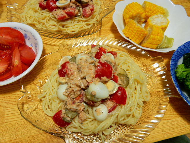 夏の路上では様々な生き物の亡き骸をよく目にします。。中でもセミの次にクマバチさんの息絶えた姿をよく見かける気が致します・・・(*´-`)  黄色い胸部と黒光りする丸い腹部、そして美しい虹色光沢を魅せるブラックスモークの羽。。大抵の場合小さな蟻たちにたかられて、土へと還る過程に入っておりますが、この写真の場合は蟻たちの他に、クマバチの周りには小さな黒い糞のようなモノがございました。。いったい誰のものなのかと少し不思議に思いました。・°・。 最近乾麺のスパゲッティをゆでる前に、しばらく冷蔵庫でひたひたの水に漬けるようになりました。生麺のような食感が味わえる上に、茹で時間も指定された時間の約半分で済むので、省エネとエコにも役立って、まさに一挙両得&環境にも優しい方法だと感じております(^-^ゞ  先日は新鮮なトマトがたくさん手に入ったので、ツナ缶とトマト、ウズラのゆで卵にピクルスをあえたものをパスタに絡めていただきました(o^-^o)♪