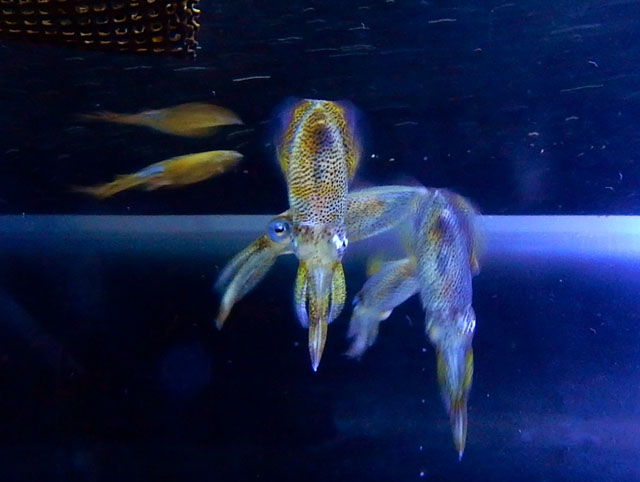 八景島シーパラダイス訪問記・その5をお届けいたします・・・わたくしの好きなアマモ場水槽ですが、これまたユニークでおどけたお顔の方が、水槽の前面でじっとこちらを見ておりました(^^) 後で友人からオニゴチだと教えていただきましたが、鬼と言うにはあまりにかわいらしい姿形でございました♪ 体高のあるボディに尾ビレ以外は黒いヒレの色をしていて、お腹のあたりが薄っすらと虹色光沢をしたお魚がいたのですが、お名前が分からなくて気になりました。・°・。アオリイカの水槽では、まだ身体のサイズの小振りなイカたちが水面近くで群れておりました。・°・。*