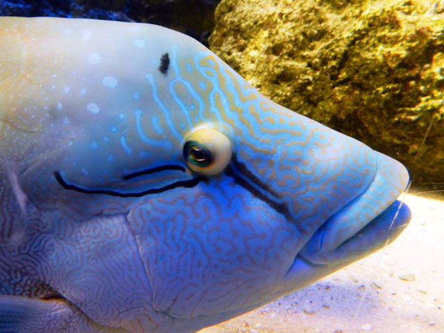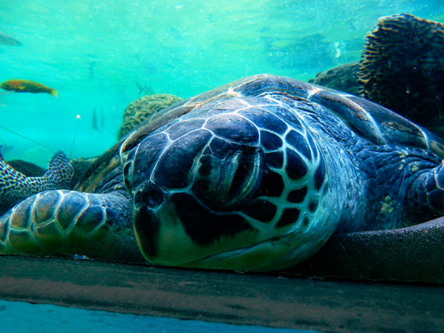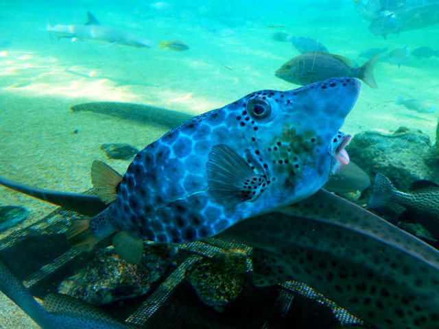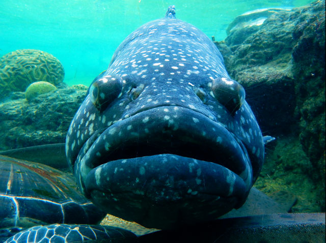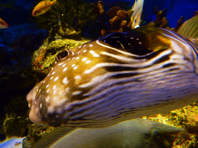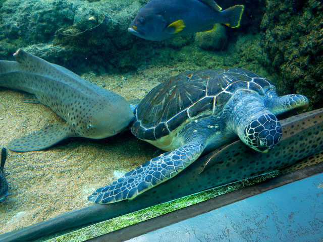 八景島シーパラダイス訪問記・その7をお届けいたします・・・「アオウミガメがすむ海」水槽にはトラフザメさんも居て、アオウミガメさんと仲良く?共存している様子でした。初めの写真では、なんとなく甲羅の縁をかじられている?ようにも見えました(^_^;) 一方で、トラフザメさんの背びれの縁は、ブダイの仲間がかじっておりましたが、痛みを感じていないのか・・・?トラフザメさんの方はほとんど気にしていない様子でした(・・;) こちらで初めて観たテングハコフグさんは、とても立派なお鼻をお持ちで、なんだか魚というよりも人に近い顔立ちに感じられました(^^) 近くで観ていた少女が「パパ、このお魚お鼻があるよ・・・」と少し怯えた様子で脇にいる父親に問いかけておりました ^^; 大きなタマカイさんを真正面から観ると、なんとなくシーラカンスのようにも見えました。・°・。*