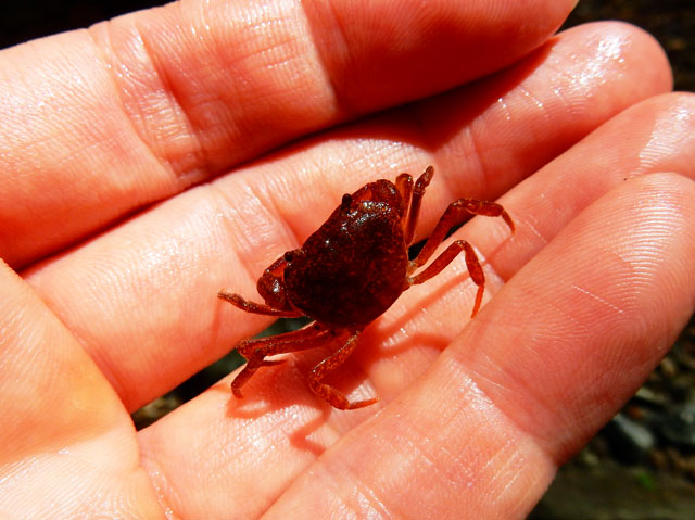 山のガイドにも掲載されていたサワガニをぜひ見つけたいと思い、水中に目を凝らして見ると・・・そっと持ち上げた石の下に、小さなカニさんが潜んでいるのを確認しました(°▽°)! できるだけ刺激しないように手の平ですくい上げると。。最初は素早く水に戻ろうとしましたが、間もなく落ち着いてくれて、日向のもとで写真を撮らせていただきました Y(i-i)Y 赤茶色の綺麗な体色の個体でした。。そして、サワガニさんは再び清流へと戻ってゆかれました。・°・。*