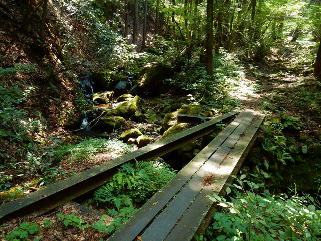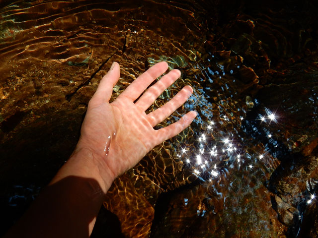 しばらく歩くと早速清流が現れました( ´ ▽ ` )ノ 鉄骨を数本渡しただけの簡単な橋を渡って、石伝いに清流まで下りてみました。キラキラと木漏れ日を反射した水面に手を差し入れると・・・冷たい水が心地よく感じました(⌒‐⌒)