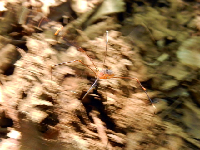 しばしカニと戯れて暑さを忘れ、わたくしも再び登山路へと戻って歩みを進めました。清流の近くだけでなく、森全体が緑の苔に覆われた道がしばらく続いておりました。・°・。そんな湿り気の多い林床を、たくさんのザトウムシさんの仲間が歩きまわっておりました。意外に敏捷な動きと日陰で薄暗いため、なかなかまともに写ってくれませんでしたが、木漏れ日の当たる場所で流し撮りを試みたところ。。ブレながらも、なんとかアカサビザトウムシさんだと分かる程度に撮れておりました(*^_^*) その3へつづく・・・アトリエ☆イボヤギ 木村大介