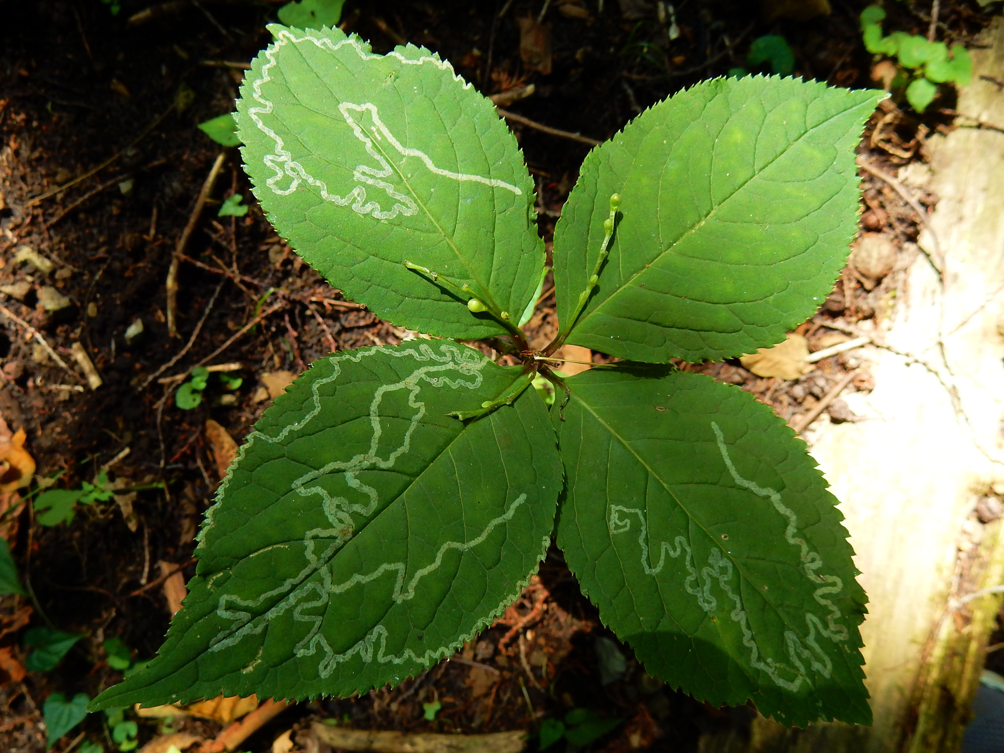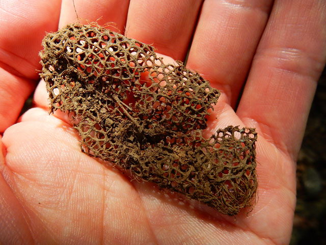 林床の小木の葉には、絵描き虫の仕業と思われる白い線画が見られました。おそらくハモグリバエのような虫の幼虫に、葉の中に潜り込まれて食されたものと思われますが、とてもアートフルでした。・°・。今回の山行ではキノコの姿をたくさん見かけました。拳ほどもある大きなキノコもありました(わたくしの手が大きめの為、キノコがあまり大きく見えないかもしれませんが・・・)  誰かに踏まれて潰れておりましたが、スカシダワラを拾いました。これはヤママユガ科のクスサンという蛾の蛹が収まっていた繭(まゆ)ですが、繭の形態を示した別名の通り、スカスカの網目のような造形がとても面白くて、以前に「むし展」でこれをモチーフにしたランプシェードをこさえたことがございました。・°・。(☆_☆)