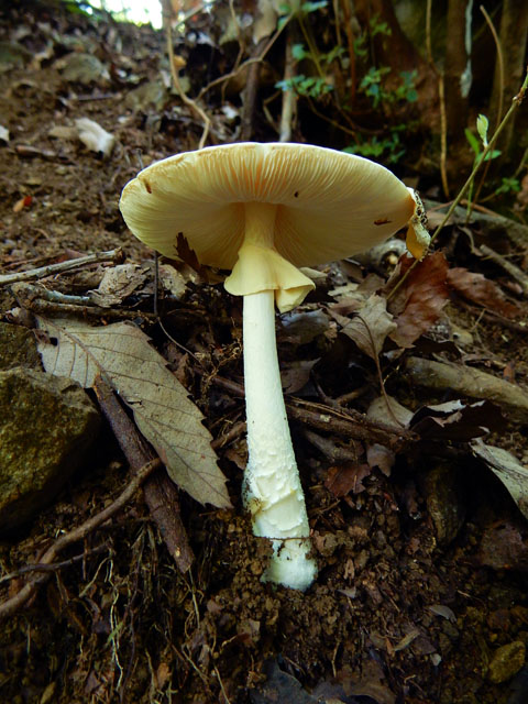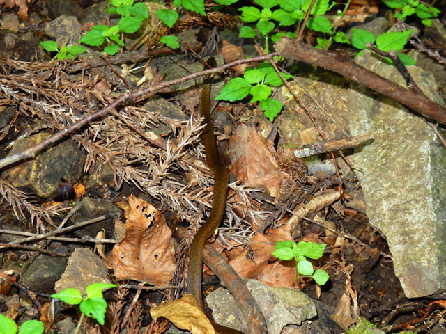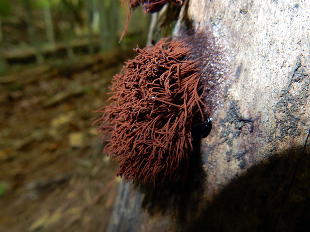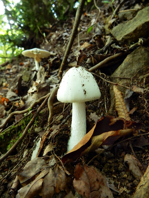 出発地点でも見かけたテンナンショウ属の実ですが、今度は全体が赤々とよく熟したのを見つけました。その鮮やかさは、谷間の仄暗い緑の世界ではかなり目立っておりました。・°・。倒木に沿って真っ白いサルノコシカケ科のキノコが生えておりました。写真を撮っていると、とてもスレンダーなアリが一匹現れて、白いキノコの上を探検し始めました。・°・。*