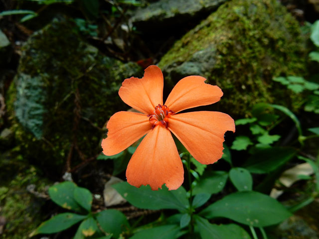 山梨県の倉岳山登頂記・その3をお届けいたします・・・今回の山行ではメインの倉岳山の隣りにある天神山と高畑山にも登りました。まずは高畑山へ向かう道に入って、思っていたよりも急な上り坂を、滝のような汗を流しつつ日頃の鍛錬を活かして突き進みました。・°・。道標の近くにはナデシコの仲間のフジクロセンノウの朱色の花が、一面緑の中でとても目立って咲いておりました。・°・。風化して白っぽくなった、巻き数の多いマイマイの殻も見掛けました。・°・。◎