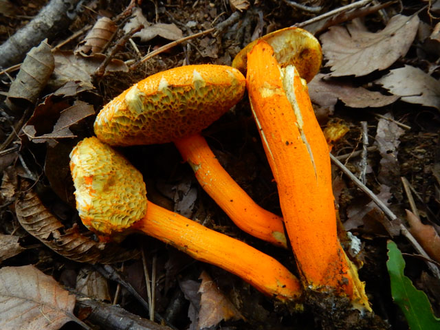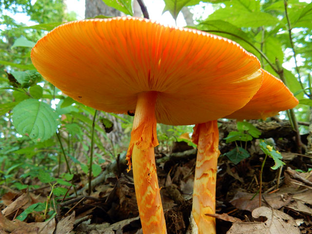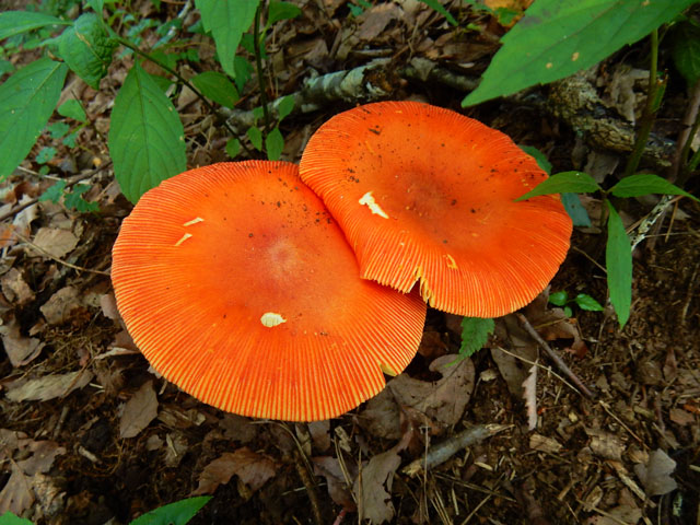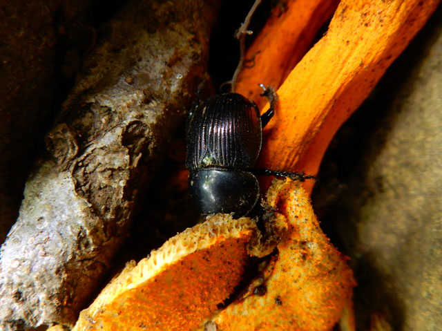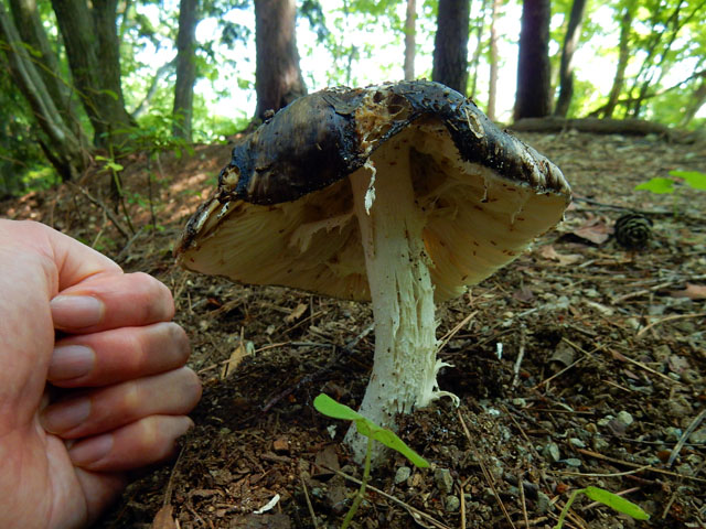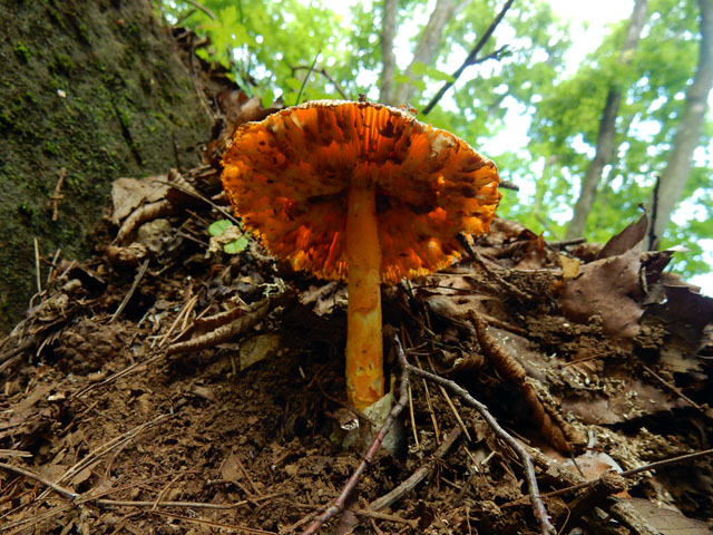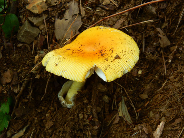 少し薄暗い斜面に生えている樹の幹では、粘菌(変形菌)の仲間のムラサキホコリの子実体も、いくつか見掛けました。・°・。そして山頂が近づくに連れて、タマゴタケの姿もよく目にするようになりました。少し古くなったキノコの傘の裏側を見上げると、たくさんのキノコ食の虫の姿も観られました。・°・。*