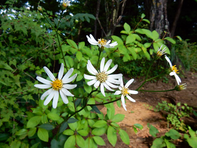 しばらく薄暗い山道を登って行くと前方が明るくなって参りました。。そして、いよいよ最初のピークである高畑山の山頂へとたどり着きました(°▽°)! 足元には秋っぽいキク科の花が咲いていて、ヨメナの仲間かな?と思いましたが、詳しくは判りませんでした。・°・。高畑山の標高は千メートルに少し及ばない982mですが、山頂を吹き抜ける風は汗ばんだ身体にとても心地よく、たいへん涼しく感じられました。・°・。(⌒‐⌒)