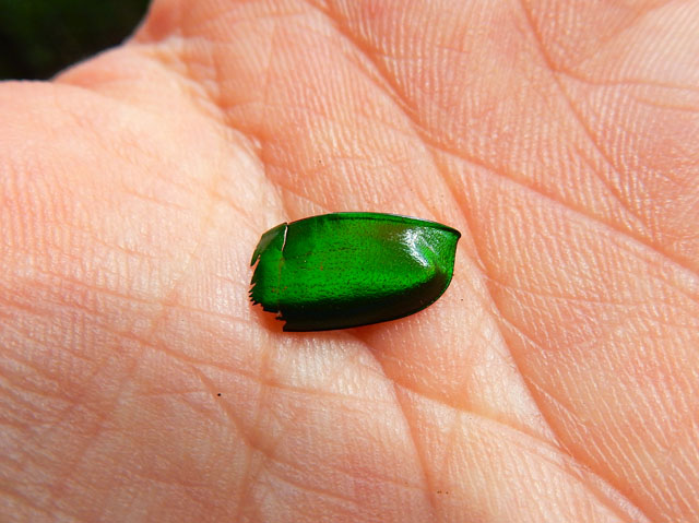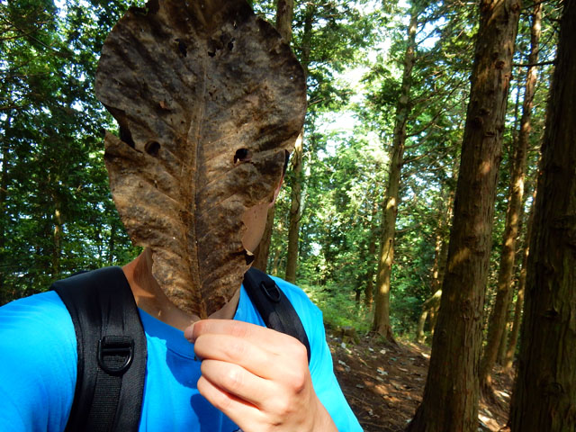 山梨県の倉岳山登頂記・その5をお届けいたします・・・倉岳山への登頂を果たして、下山途中にもたくさんのステキな自然に出会いました。・°・。陽光に照らされたアオカナブンのものと思われる、金緑色に輝く鞘羽の一部を拾いました。・°・。ホオノキの大木が多く生えているエリアでは、ちょうど目の位置に穴の空いた大きな枯れ葉を見つけました(°▽°)!  まるで手持ち花火か、弾けたパーティー・クラッカーのようなコウヤボウキの花も咲いておりました。・°・。*