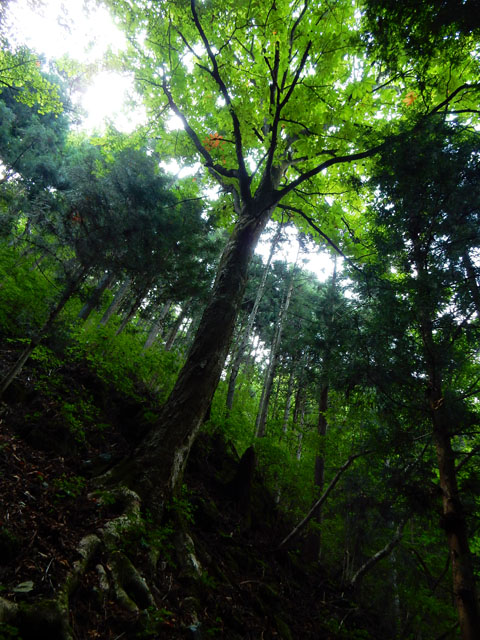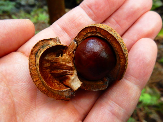 トチノキの大木の生えている場所では、急な斜面にも見上げるような立派な樹がそびえ立っていて、その姿には神々しささえ感じました・・・(*_*) 山道にも栃の実がいくつも落ちておりましたので、そのひとつを拾い上げてみました。パカっと割れた果皮の中身は美味しそうでしたが、アク抜きと加工の下処理の大変さを思うと・・・持ち帰るのは差し控えました。。(・・;)
