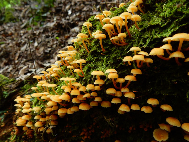 足を浸した地点では細い流れだった沢の水も、下るに連れて水量も増えて参りました。・°・。沢沿いの道を歩いていると、足元から何か細長いモノが飛び跳ねました(*゜0゜)! 驚いて後ずさりすると、するすると茶色いものが沢の方へ這って行きました。。しばし止まってくれたので、よく観ると頭の後ろの模様などからも、どうやらヒバカリのようでした。。あちらも突然の出会いに驚いたようで、山道を横切る直前に、慌てて方向転換を図ったのだと判りました・・・(*´-`) 苔むした大きな倒木に、幅約1メートルに渡って小さなキノコがびっしりと生えておりました。傘の直径は1センチ程度と、とてもかわいらしい姿でしたが、後で調べてヒナノヒガサという種類だと知りました。漢字で書くと「「雛の日傘」」とのことで、まさに言い得て妙だなと納得いたしました(⌒‐⌒)。・°・。その6へつづく・・・アトリエ☆イボヤギ 木村大介