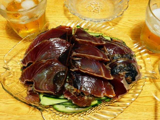 閉館時間までたっぷり観覧して科博を出ると、西陽の差した石畳の上に魚の干物のようなモノを見つけました・・・しゃがみ込んでよく見ると、どうやらニホンヤモリさんのミイラ状になった亡き骸のようでした。。まるで保護色のように石畳に溶け込んでおりました。・°・。今宵は値引きゲットした鰹のたたきで晩酌の発泡酒をいただきました。脂が適度に載っていて大変おいしゅうございました(o^-^o)。・°・。8/6(土)の科博リポート(完)