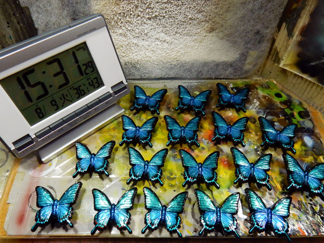 本日(8/9)のアトリエでは最高気温が36℃を超えました・・・(-_-;) さすがに体温に並ぶと、扇風機と霧吹きによる気化熱作戦だけではなかなかハードでしたが、適度に冷水シャワーを浴びるなどして、どうにか乗り切りました。。(`_´ )ゞ 写真はカラスアゲハ「B」タイプの塗装光景です。・°・。アトリエ☆イボヤギ 木村大介
