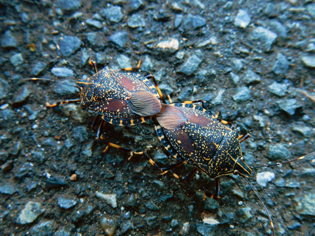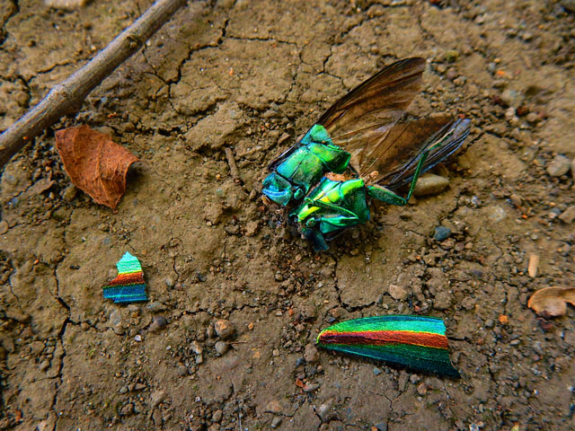 先日、8/7(日)の自然観察散策記その1をお届けいたします・・・自宅前の歩道でキマダラカメムシさんのカップルが連結したまま歩いておりました。・°・。そしてしばらく歩いた街路樹の幹にもたくさんのキマダラカメムシさんと、そのお子さま方の姿も目にいたしました。幼虫の色と姿形はまるでエイリアンのようで気に入っております(^^)♪ ここのところまとまった雨が降っておりませんが、大きなケヤキの樹々に覆われた公園の地面もカラカラにひび割れておりました。。その土の上にタマムシさんの亡き骸が散らばっておりました。・°・。☆