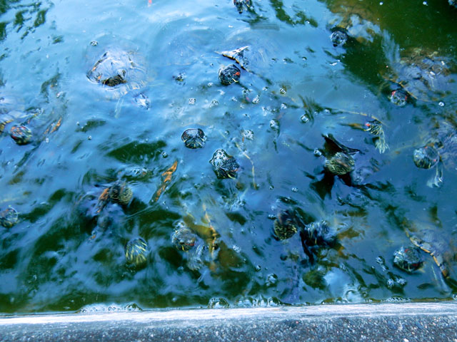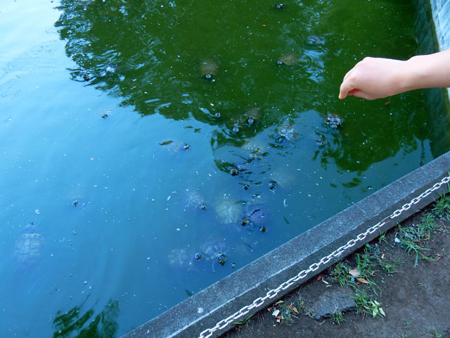 雑木林を抜けた先の、病院の跡地にある大きな池では、たくさんの亀が泳いでおりました。。友人が手をかざすと餌をもらえると思ったようで、次々と岸辺に寄って参りました。・°・。ミシシッピアカミミガメとクサガメが半々くらいでしょうか?お互いに争うこと無く健気に首をもたげて立ち泳ぎする姿に、何もあげられない申し訳無さと同時に、愛くるしい姿にすっかり癒やされてしまいました。・°・。(*^_^*) 池の前にある立て札を見ると、地元に方々にたいへん愛されている亀さんたちだと感じました。・°・。(⌒‐⌒)
