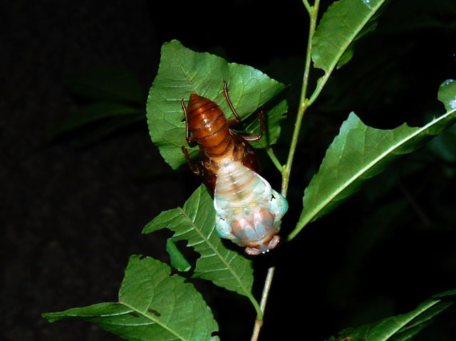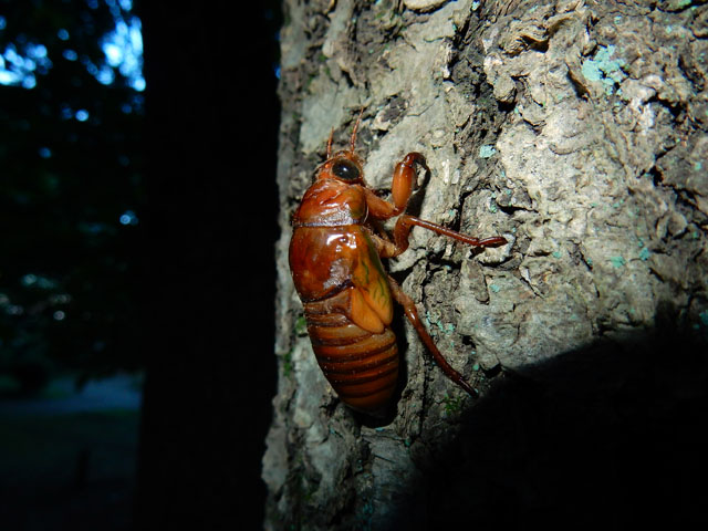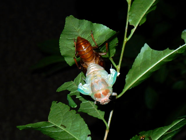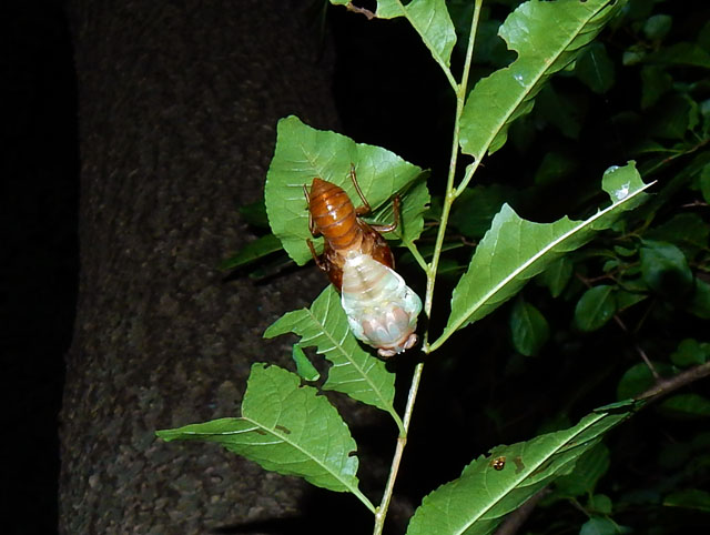樹の上の方を懐中電灯で照らしていた友人が、今まさに羽化しようとしている個体を見つけました・・・撮影し始めると思ったよりも速いペースで羽を拡げていきましたが、高い木の枝でしたので、その場ではアブラゼミかミンミンゼミかの判別はまだ出来ませんでした。・°・。その3へつづく・・・アトリエ☆イボヤギ 木村大介