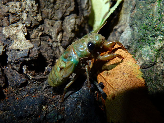 先日、8/7(日)の自然観察散策記・その3をお届けいたします・・・アブラゼミの羽化を観察している間に、友人が今度はツクツクボウシさんの羽化前幼虫を見つけました! わたくしも友人もツクツクボウシの幼虫を観るのは初めてでしたので、とても感激いたしました(≧▽≦) そしてとても意外だったのが、その動きのすばしこさでした(*゜0゜) 写真を撮ろうと構えている間にひょこひょことよく動き回って、気を抜くとすぐに見失いそうな程でした。。大きくてつぶらな瞳と青みの強い体色も印象的でした。・°・。*