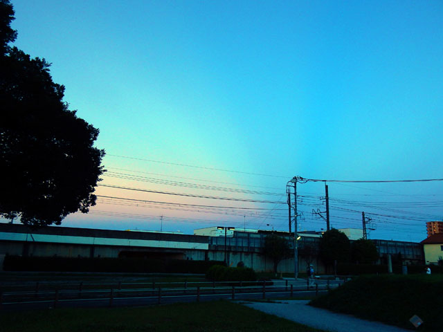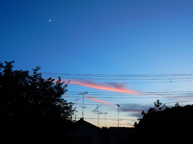 先日、8/7(日)の自然観察散策記・その2をお届けいたします・・・西の空に細い月が明るさを増すに連れて、空全体もトワイライト・ブルーに染まってゆきました。・°・。低空の細長い雲は時間とともにフラミンゴ色に変わって参りました。・°・。反対側の東の空に目をやると。。向かって中央よりやや右側から、ご来光のような放射状に青い筋が数本拡がっている光景を観て、あれはいったい何だろうか?とその現象を不思議に思いました。。(*゜0゜)?