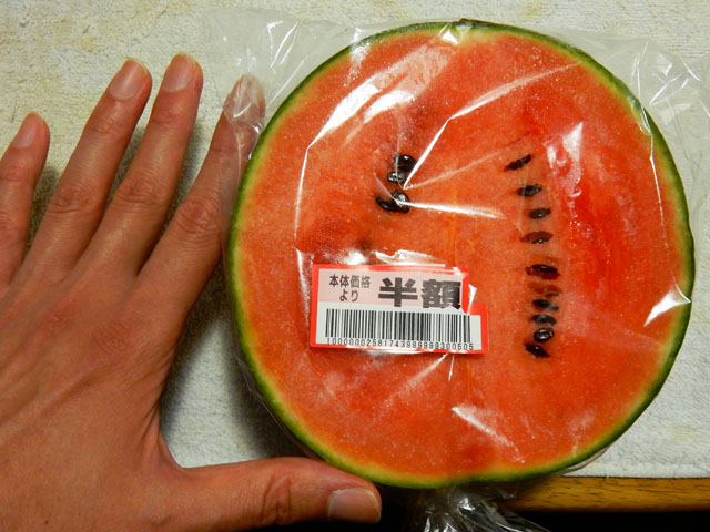 今宵は閉店間際のスーパーで、半切の小玉スイカを半額でゲットいたしました。とても皮の薄いスイカで、甘みも充分で大変美味しくいただきました♪