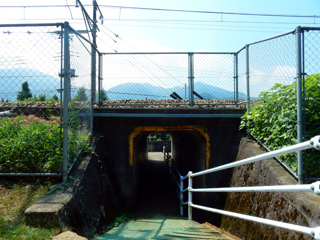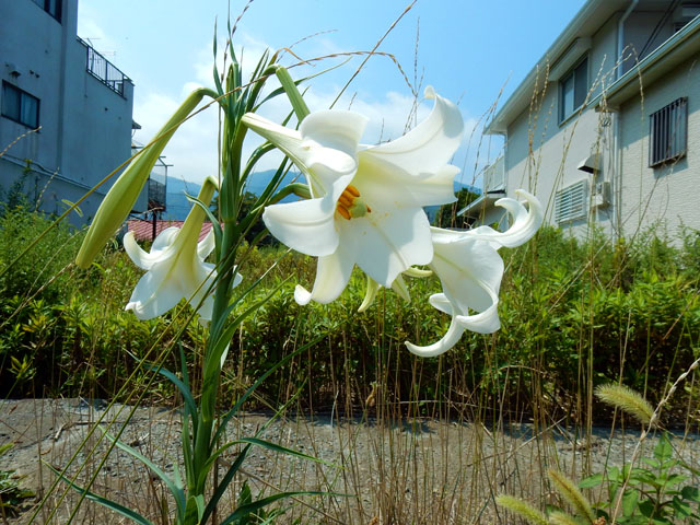 登山前にその臨時トイレで用を足してから、登山口を目指して歩き始めました。国道沿いにはテッポウユリの花が、白い花をまぶしく咲かせておりました。・°・。線路の下のアンダーパスを腰をかがめながら通り抜けると、脇を流れる水路にカナブンさんが水に浸かっておりましたので、すくい上げようとしましたが・・・既に事切れておりました。。(*´-`)