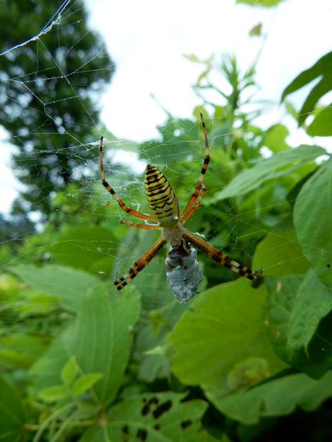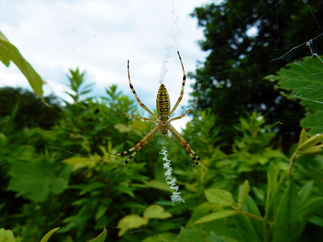 先日7/31(日)の自然観察記・その4をお届けいたします・・・「ばったランド」のクズのツルが誰かのいたずらか?あるいは自然にそうなったのか・・・サークル状に結ばれておりました。・°・。◎ 生い茂った背丈の高い草の茂みの間には、そこかしこに蜘蛛の巣が張られておりました。中でもナガコガネグモさんの白いジグザグ形の模様のある巣が目立ちました。オスはとても地味な色合いと小さな身体をしているそうで、写真の二匹はどちらもメスでした。右端の方は何か獲物を捕まえたばかりのようすでした。・°・。*