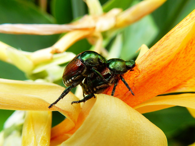 ゼリーを食べ終えて辺りを散策していると・・・何やら甘く心地よい香りが漂ってまいりました。・°・。あちらこちら鼻を効かせながら探していると。。キンモクセイによく似た淡い黄色の花がその匂いの発信源だと判りました(*゜0゜) 樹のラベルを観ると「ウスギモクセイ」と書かれてありました。本来の開花期は秋と記されておりましたが、これも温暖化の影響なのでしょうか? 友人は昔嗅いだことのある匂いだそうで、懐かしいと申しておりました。・°・。隣の花壇にはカンナの花が咲いておりました。花の上にはたくさんのマメコガネさんたちが、お食事に来ておりました。・・・中には花より色気のお方も見受けられました。・°・。(*^_^*)