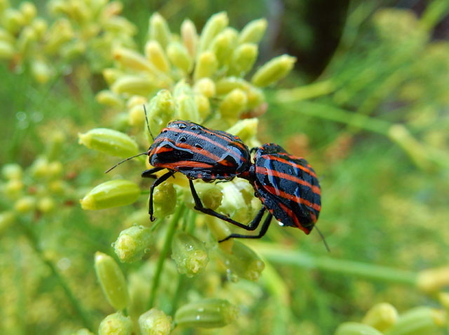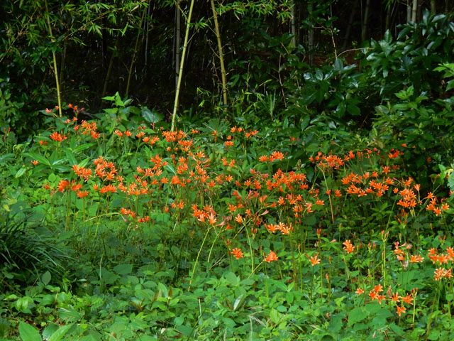 乾いた石垣の上に置くと幾分落ち着いてきて、友人の手の上でおとなしく安全な場所まで運ばれました。・°・。湧水路沿いに歩いていくと、竹林の間にヒガンバナ科のキツネノカミソリの群落が、朱色の花を咲かせておりました。・°・。この間キアゲハさんの幼虫を見かけたフェンネル(ウイキョウ)の株には、急に降って来た雨に濡れながら、アカスジカメムシさんのカップルが愛のいとなみを継続しておりました。・°・。*