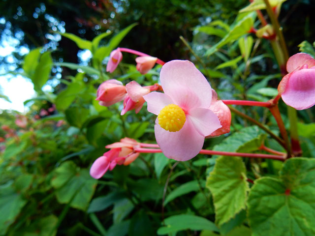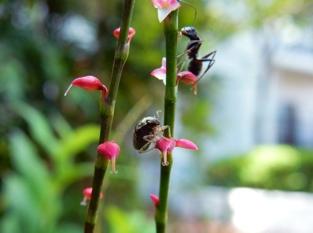 シュウカイドウのお隣にはミズヒキの細やかな赤い花も咲いておりました。クロヤマアリさんが細い枝を昇ったり降りたりする中、小さなカメムシさんがミズヒキの花の蕾に口吻を差し込んで、マイペースでお食事をされておりました。・°・。(^^) (その2へつづく・・・)