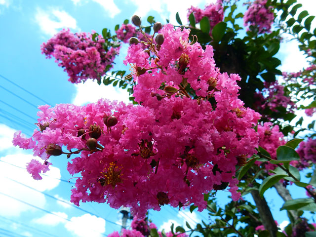 先日7/31(日)の自然観察記・その1をお届けいたします・・・近所の街路樹のサルスベリが、今年も様々な色の花をにぎやかに咲かせております。風にゆられながら、青い空と白くてまぶしい雲を背景にとてもよく映えておりました。・°・。公園の花壇にはオニユリも咲いていて、ビビッドカラーのオレンジと青空のコントラストも素晴らしかったです。・°・。半日陰にはシュウカイドウの花も咲いておりました。ベゴニアの仲間が好きなわたくしにとって、お気に入りのひとつです。・°・。*