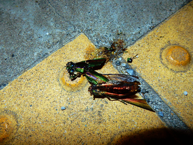 先週末の夜は、タコのパスタでお腹を満たした後、近所の雑木林に夜の虫探し散策へと出掛けました。・°・。昼間はジョギングをする人や犬の散歩などで、結構な人通りがありますが、夜も更けて参りますとひっそりとした雰囲気で、少し不気味な空気感が漂っておりました・・・生きたアオオサムシを観てみたいと希望していた友人でしたが、散策の後半でその願いが叶いました。。かさこそと落ち葉の間をかき分ける音がしたかと思うと・・・大きなミミズを抱え込んだアオオサムシさんが、こちらに向かって歩いて来たのでした(*゜0゜)! その巨大な獲物を追いかけるようにもう一匹も現れて、互いに引っ張り合うように貪り始めました(^_^;) その側の樹の上にも別の個体が歩いていて、羽化の際に何らかの問題が生じたのでしょうか?鞘羽の一部が凹んでおりましたが、夜行性らしい素早さで元気に這い回っておりました。・°・。*