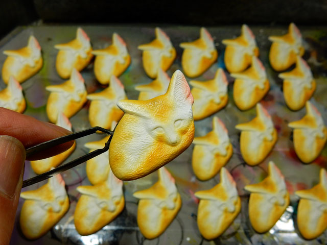 本日もブローチ作品の制作を続けました。・°・。写真はフェネックの塗装風景です。まず最初に、下地のサーフェイサーを兼ねた白色をエアブラシで吹き付けた後、耳の内側の薄桃色を重ねます。その後、黄土色調の毛色を施してゆきます。・°・。* 獅子唐が値引きでゲット出来たので、大好きな天ぷらにしていただきました。サクッと揚がったところに、軽く塩をまぶして熱々をいただくのがたまりません。。(≧▽≦) たまに当たる激辛の実が、夏バテ防止の良い刺激?になっております・・・(*^_^*) アトリエ☆イボヤギ 木村大介