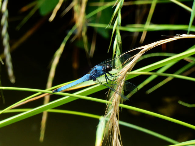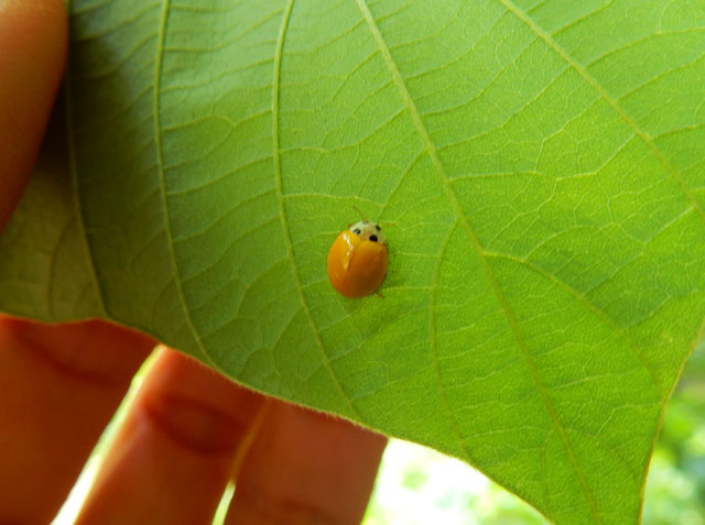 別の木の葉の裏には、今年初めてお目にかかるキイロテントウさんもおりました♪ 池の方に歩いてゆくと、水面にせり出した草の茎の上に、オオシオカラトンボさんが留まっておりました。周囲を忙しそうにパトロールしたり、交尾相手をゲットしている輩もおりました。・°・。*