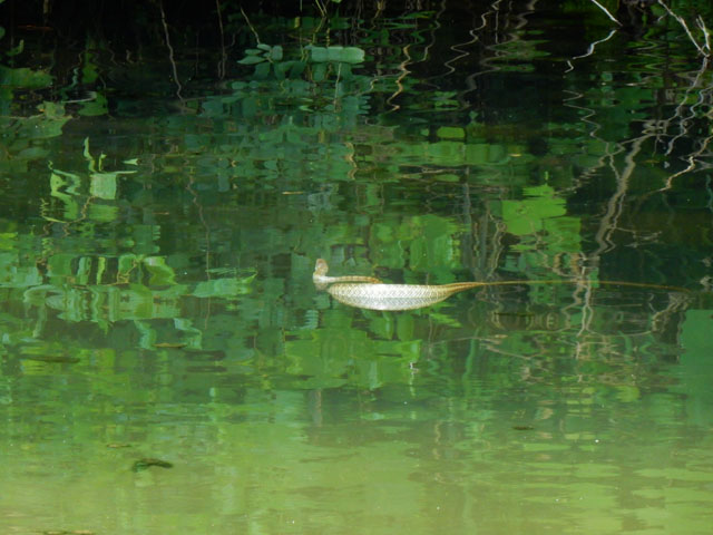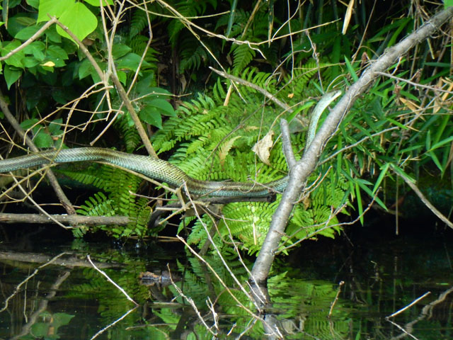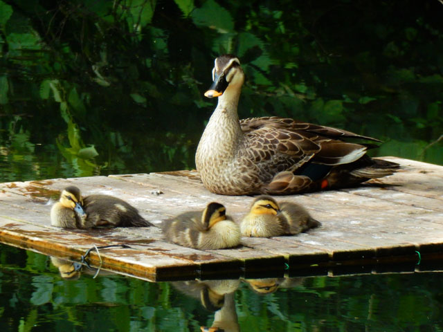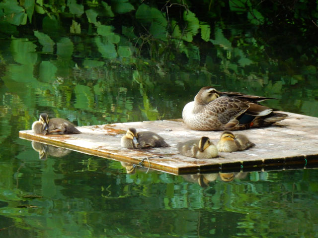 しばらく公園の中を散策していると、後ろの方から「あれ?蛇じゃない?!」という声が聴こえて来ました・・・先程の池の方へ戻って水面を観ると、大きなヘビが身体を左右にくねらせながら、優雅に泳ぐ姿が確認できました(*゜0゜)身体のサイズと青味がかった体色から、アオダイショウであることが判りました。。その気配に気付いたのか、うたた寝をしていたカルガモの親鳥が首を上げて、警戒態勢に入っておりました。。しばらくヘビの方を睨んでおりましたが、ヘビは方向を変えて岸辺の枯木によじ登り始めました・・・ヒナの数が減ってしまったのは、もしかしたらこのアオダイショウのお腹に収まってしまったからなのでしょうか。。(^_^;) その3へつづく・・・アトリエ☆イボヤギ 木村大介
