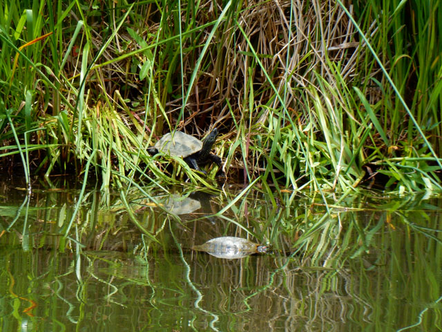 昨日訪れた湿地帯と池のある公園訪問記のつづき・その2です・・・公園にある広い池にはクサガメとミシシッピ・アカミミガメの姿も観られました。アカミミガメさんは水面にのんびり浮かんでゆっくりと漂っておりました。・°・。奥の岸に近い辺りには木製のフロートがあって、その上にはカルガモの親子が休んでおりました。ヒナの数は4羽でしたが、もしかしたら兄弟姉妹はもっとたくさんいたのかな・・?と思われました。・°・。*