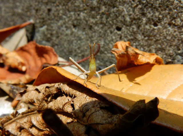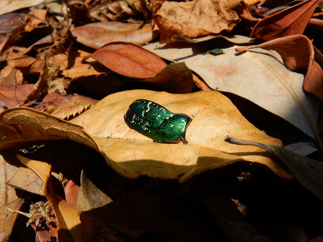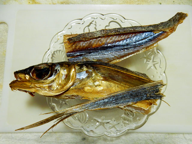 歩道沿いの吹き寄せられた落ち葉の上に、ハナムグリさんの鞘羽が片方落ちておりました。陽射しを反射した緑金色がまぶしく輝いておりました。・°・。そのすぐそばには、オンブバッタのような顔をした小さなバッタさんが、じっとこちらを見つめておりました。・°・。炎天下を歩いてたくさん汗をかいたので、今宵は先週食べたトビウオの燻製のもう半分を肴にして、発泡酒をおいしくいただきました。・°・。<・)))><<