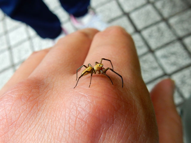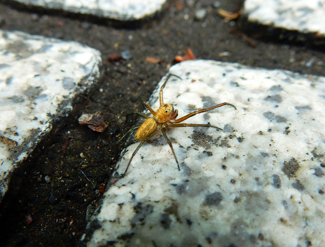 関東地方も梅雨入り宣言の出された本日、雨上がりに近所を散策していると、紫陽花もきれいに色づき始めておりました。・°・。染まり始めがオオイヌノフグリみたいな色合いのものや、紫色に赤味のさしたものなどもございました。・°・。そのあじさい通りの歩道に一匹の黄土色のクモが舞い降りました。。