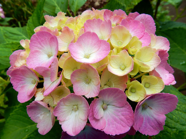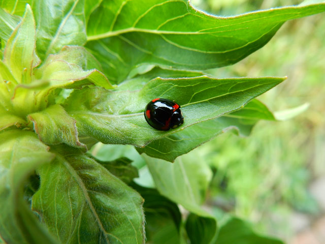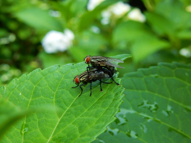 頭の高さくらいに伸びた紫陽花の葉の上には、大型のイエバエの仲間がお取り込み中でした。・°・。下の雌の方はこちらを警戒して飛び去りたい様子でしたが、上の雄はまだまだ踏ん張りたいご心境のようでした。・°・。漆器を思わせるような、配色センスの良い和的なナミテントウさんも見掛けました。・°・。雨上がりの散策記・その2へつづく・・・アトリエ☆イボヤギ 木村大介