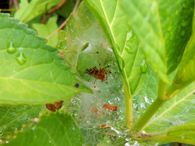 手の甲に誘導してみると、後ろ側にある単眼でこちらをじっと観察している目線を感じました・・(・・;) しばらく歩いて、いつも自然観察マイフィールドにしている雑木林に入りました。・°・。草の茎の上に居たササグモさんは、触肢先端が太くて黒っぽかったので、おそらく雄ではないかと思われます。・°・。紫陽花の葉の間にこさえた、水滴を纏った棚状の巣の奥に居たのは、クサグモさんの亜成体かな?と思われました。幼体は赤っぽい色をしているそうですが、徐々に赤味が薄れていくようです。・°・。*